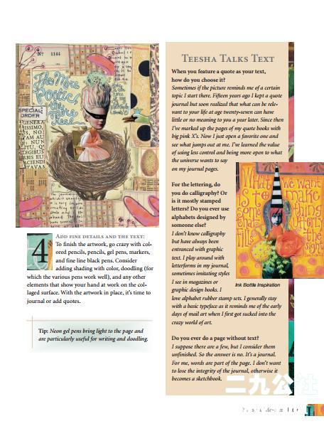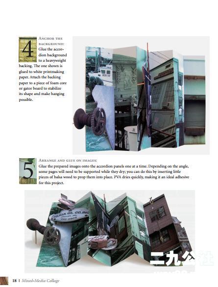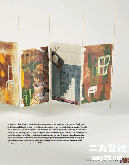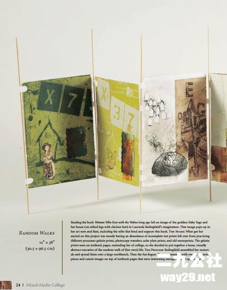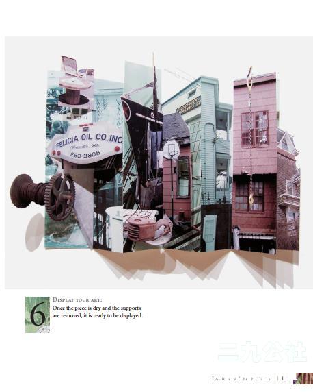用丙烯酸凝胶介质(不需要热调色板或蜡)制作人造彩画的技术,在纸上添加缝合,在表面分层,从文本中寻找灵感,用缝合的接口建造神龛和书页面板,使用简单的版画技术创建独一无二的拼贴材料,构建三维空间照片拼贴画等等